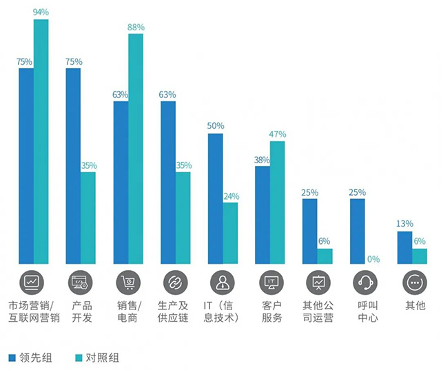 另一个值得关注的方向是“IT(信息技术)”一项上,领先组企业的占比(50%)也大大高于对照组企业(24%),数字化的基础是信息技术,这说明企业要推动数字转型,需要打牢技术基础,否则数字化转型将会是空中楼阁。