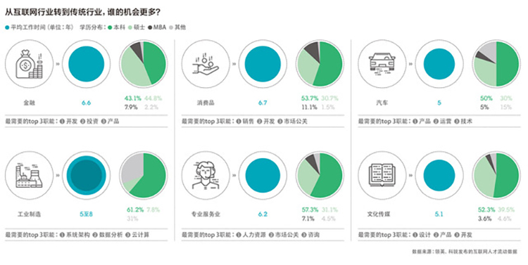 从领英的调查数据来看,由互联网转入传统行业的人中,20%进入了专业服务业,数量最多。