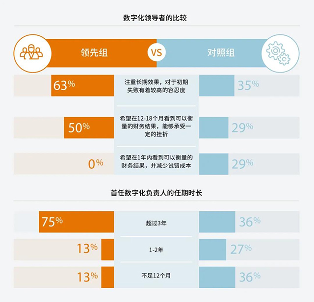 “领先组”和“对照组”企业之间的一个主要区别,是最高领导层如何衡量成功和看待初期挫折的成本。领先组的企业往往比较注重中长期的效果,并且对初期失败具有较高的容忍度,达到63%,而对照组为35%。同时,领先组企业并不强制要求在一年内看到可以衡量的财务成果,或要求尽量减少试错成本。相比之下,对照组中将近30%的企业有这种要求。