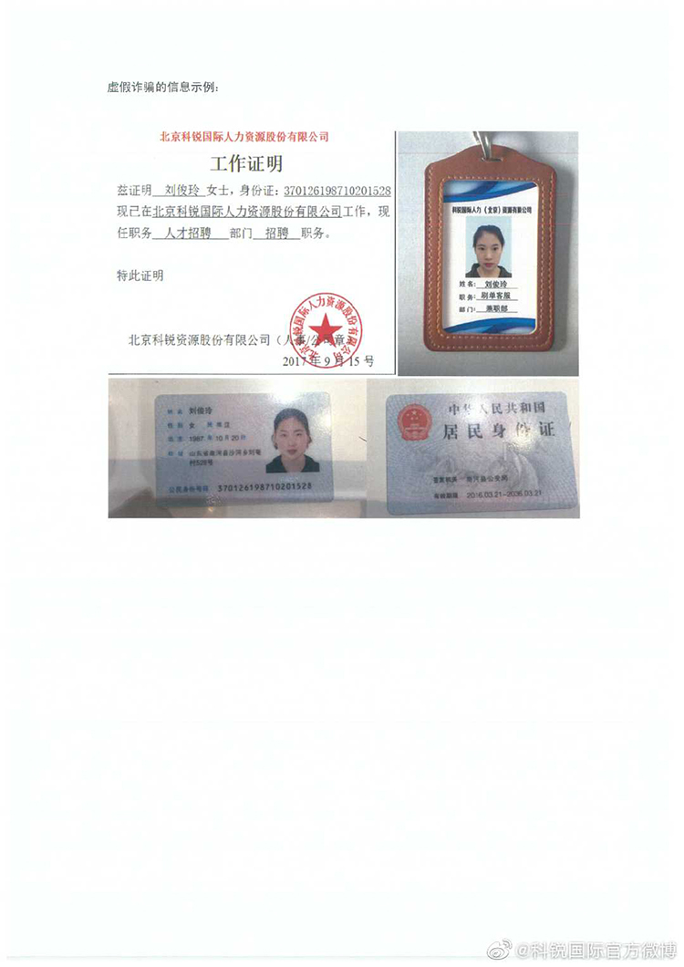 人力资源股份有限公司”以及旗下关联公司员工名义,非法上传我司营业执照图片,并伪造我司公章,进行兼职刷单业务并实施诈骗。