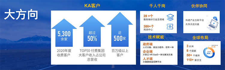 是领先的以技术驱动的整体人才解决方案服务商,也是国内首家登陆A股的人力资源服务企业(300662.SZ),目前在中国、印度、新加坡、马来西亚、美国、英国、澳大利亚、荷兰等全球市场拥有110+家分支机构,2,600余名专业招聘顾问及技术人员,在20+个细分行业及领域为客户提供中高端人才访寻、招聘流程外包、灵活用工、人力资源咨询、培训与发展、薪税外包等人力资源全产业链服务,同时提供一体化SaaS云产品、垂直招聘平台、人力资源产业互联平台及人才大脑平台。通过构建“技术+平台+服务”的商业模式,打造产业互联生态,为企业人才配置与业务发展提供一体化支撑,为区域引才就业与产才融合提供全链条赋能。在过去一年中,服务超过5,300家跨国集团、国内上市公司、快速成长性企业、国企、政府以及非盈利组织,成功推荐中高端管理及专业技术岗位人员25,000余名,灵活用工累计派出190,000余人次,聚合合作伙伴近3,500家。
