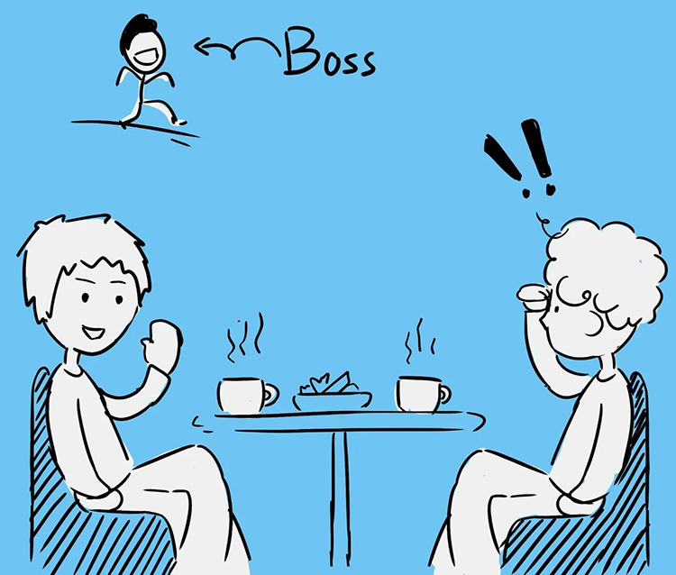 刚拿到咖啡啜了一口,一个洪亮的声音响彻我的心灵。沿着声音望去,一人着装商务,一边与同行人聊天,一边迈着气定神闲的步伐向我的方向走来。这人...该不会...什么?!真的是他——老板!