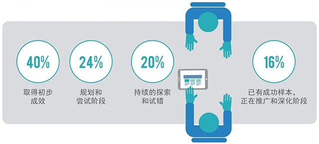 从调研总体看,40%的企业在数字化转型中“已取得初步成效”,24%的企业处于“规划和尝试阶段”,20%的企业正在“持续的探索和试错”。最后仅有16%的企业“已有成功样本,正在推广和深化阶段”。虽然数字化转型在企业的广泛实施已超过5年,但能够取得成功样本的企业“不足两成”。