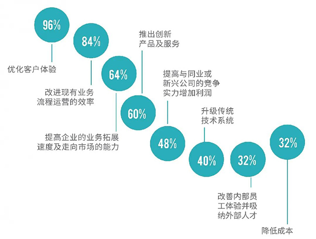 总体来看,企业期望通过数字化转型达到“优化客户体验”选项的占比最高,达到了96%,其次是期望“改进现有业务流程运营的效率”,占比84%,同时,还有超过半数的企业希望“提高企业的业务拓展速度及走向市场的能力”(64%),以及“推出创新产品及服务”(60%)。