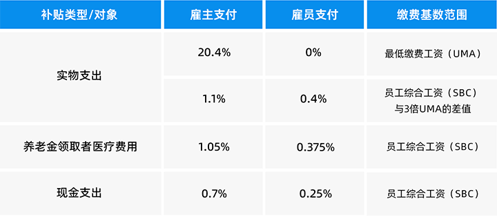 每年相关机构将更新最低缴费基数工资(UMA)。社会保险最高缴费基数为UMA的25倍。通常来说,雇员的缴费基数工资为其个人综合工资(SBC),包含个人基本工资、各类季度年度奖金、非现金津贴综合折算等。