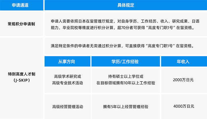 此签证适用人群为在日从事高级学术研究/高级专业技术研究/高级经营管理活动的专业人士,相关人才可通过常规积分制或J-SKIP制申请此类签证。