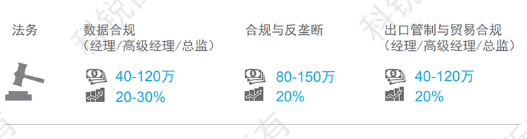 随着内资企业发展阶段的变化及规模的扩大,对于公司合规与反垄断的需求有所增长。有海外业务的部分硬件类企业今年对于IP海外诉讼类职位需求增长非常明显。随着企业越来越重视对基金合规方面的需求,虽然目前暂时没有形成单独的岗位设置,但也会越来越多融合进对法务岗位的需求中。