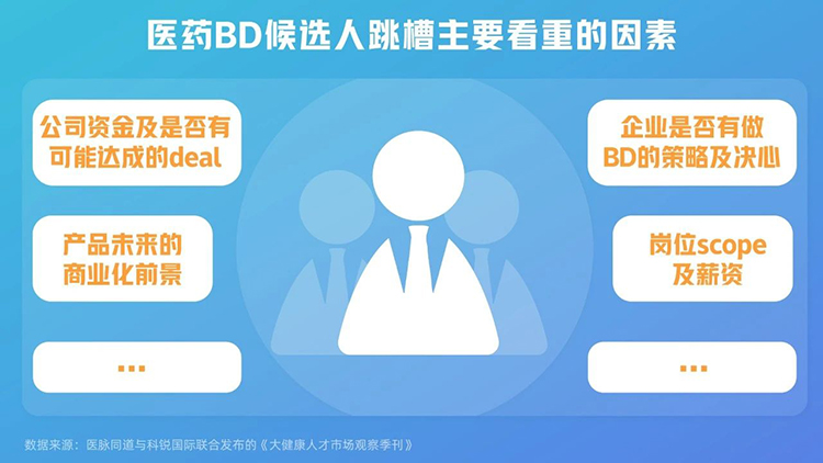 谈及候选人跳槽主要看重的因素,企业是否有做BD的策略及决心、公司资金及是否有可能达成的deal、产品未来的商业化前景、岗位scope及薪资等都是考察的点。其中,人选能力与企业的契合度尤为重要。这就需要能有专业招聘经验的人力资源机构,专注医药BD岗位,能结合特定企业发展策略和阶段,为其匹配最契合的候选人。