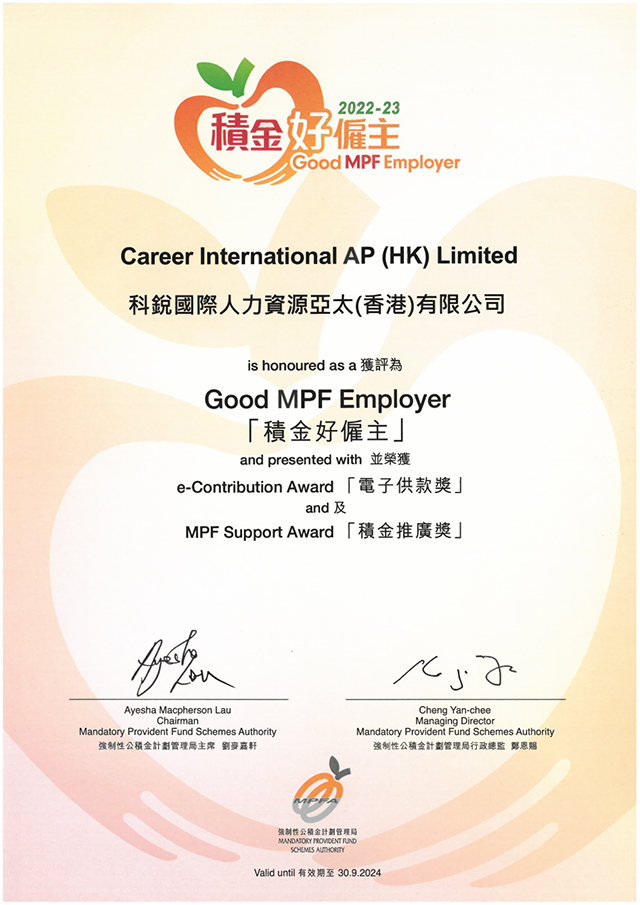 香港分公司连续三年获评“积金好雇主”殊荣,并同时获颁“电子供款奖”及“积金推广奖”。