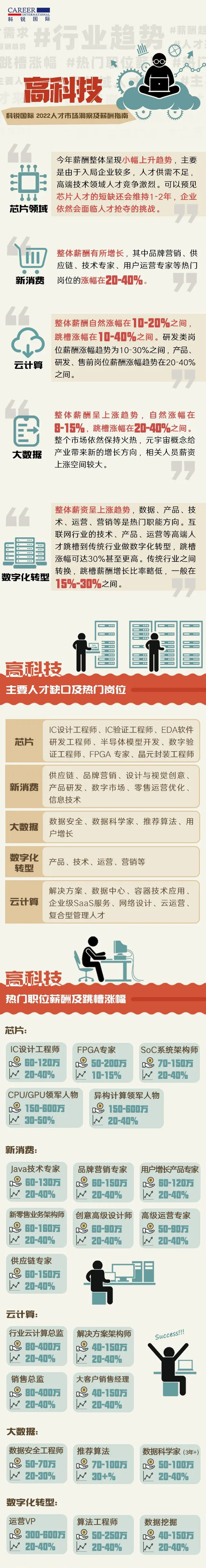 在新的全球竞争格局下,创新驱动成为实现高质量发展的重要因素。疫情常态化趋势下,数字新基建的精准发力,不仅成为促消费、稳增长的关键之举,筑牢高质量发展之基,也将助力产业升级,带动就业创业。智慧城市、数字乡村战略下,有序开展5G和千兆光网建设,加快5G、物联网、车联网、工业互联网、云计算、大数据等领域布局,以及元宇宙应用等的纵深发展。外部环境的不确定性和多变性愈发显著的大背景下,企业纷纷谋求跨界转型,催生大量高科技行业及细分板块人才紧缺需求,尤其热点领域如芯片、数字化等人才缺口与争夺异常激烈。2022年,非凡国际 猎头公司市场研究中心连续第十年权威发布薪酬报告——《人才市场洞察及薪酬指南》,本文带来薪酬报告内高科技行业的人才市场洞察。