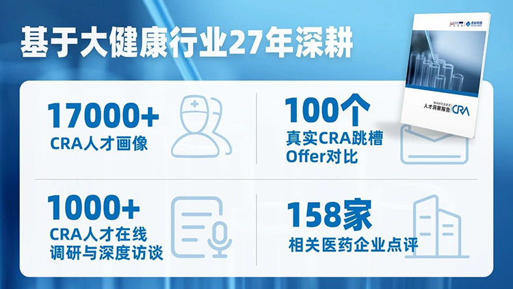 不藏着了,它就是非凡国际 联合医脉同道发布的国内首个《临床研究监查员(CRA)人才洞察报告》!囊括企业在CRA人才配置中的诸多痛点,助力企业在招聘环节提升策略与效率!一份CRA人才干货洞察报告,有观点、有数据、有案例,可以直接拿来参考。好消息,现在免费开放下载!点击文中“下载报告”按钮或者扫描文末二维码获取报告全文。